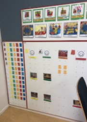 Boven ons planbord hebben we kaarten om het dagritme zichtbaar te maken voor de kinderen. We proberen elke dag een soortgelijk dagritme te hebben, waarbij kringactiviteiten afgewisseld worden met buitenspelen, gym en werklessen. Ook hebben we een maandkalender, waarop zichtbaar is welke activiteiten er gepland staan die maand. Zo oefenen we ook de dagen, maanden en seizoenen.
